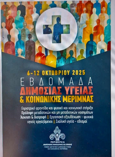 Ολοκληρώθηκε η Εβδομάδα Δημόσιας Υγείας 2025 6-12/10/2025 της Γενικής Διεύθυνσης Δημόσιας Υγείας και Κοινωνικής Μέριμνας της Περιφέρειας Ανατολικής Μακεδονίας Θράκης η οποία περιελάμβανε περισσότερες από 100 δράσεις ενημέρωσης, εκπαίδευσης, καθοδήγησης, ευαισθητοποίησης, σε όλες τις Περιφερειακές Ενότητες και με θεματολογία όπως: Άσκηση και Διατροφή , Πρόληψη Λοιμωδών και μη Λοιμωδών Νοσημάτων, Υγιής Γήρανση, Εργασιακή Εξουθένωση, Σχολική Υγεία- Εθισμοί, Πρόληψη Σεξουαλικώς μεταδιδόμενων Νοσημάτων, Εμβολιαστικές Παρεμβάσεις, Δωρεά μυελού των οστών, Ευαισθητοποίηση για Α.Μ.Ε.Α. Οι συγκεκριμένες δράσεις κατάφεραν να κινητοποιήσουν την κοινότητα και να επισφραγίσουν πολύτιμες διατομεακές συνεργασίες με φορείς Υγείας, Συλλόγους πολιτιστικούς, Συλλόγους Ασθενών, Ακαδημαϊκή Κοινότητα, Εκπαιδευτική- Μαθητική Κοινότητα.